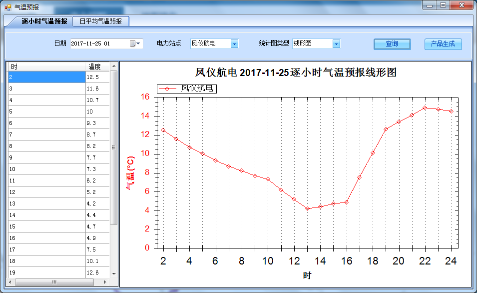 氣溫預(yù)報(bào)包括逐小時(shí)氣溫預(yù)報(bào)和日平均氣溫預(yù)報(bào),主要根據(jù)預(yù)報(bào)日期、電力站點(diǎn)等條件,可以線(xiàn)形圖、散點(diǎn)圖、柱狀圖等統(tǒng)計(jì)圖類(lèi)型,完成氣象預(yù)報(bào)數(shù)據(jù)的統(tǒng)計(jì)圖分析制作,并完成氣溫預(yù)報(bào)服務(wù)產(chǎn)品的制作。